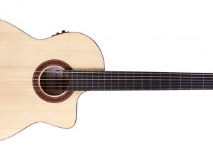 - Mặt trước được làm bằng gỗ Solid Sitka Spruce cao cấp, mặt sau và hai bên Solid Pau Ferro vững chắc.