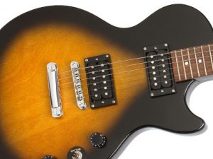 Body Body shape: Single cutaway Body type: Solid body Body material: Solid wood Top wood: Not applicable Body wood: Poplar Body finish: Satin Orientation: Right handed Neck Neck shape: '60s SlimTaper D Neck wood: Mahogany Joint: Bolt-on Scale length: 24.75 in. Truss rod: Standard Neck finish: Satin Fretboard Material: Rosewood Radius: 14 in. Fret size: Medium jumbo Number of frets: 22 Inlays: Dot Nut width: 1.687 in. (42.8 mm) Pickups Configuration: HH Neck: 650R Middle: Not applicable Bridge: 700T Brand: Epiphone Active or passive pickups: Passive Series or parallel: Series Piezo: No Active EQ: No Special electronics: None Controls Control layout: Master volume, tone Pickup switch: 3-way Coil tap or split: No Kill switch: No Hardware Bridge type: Fixed Bridge design: Tune-o-matic Tailpiece: Stopbar Tuning machines: Die-cast Color: Chrome Other Number of strings: 6-string Special features: Vintage worn finish Case: Sold separately Accessories: None Country of origin: China
